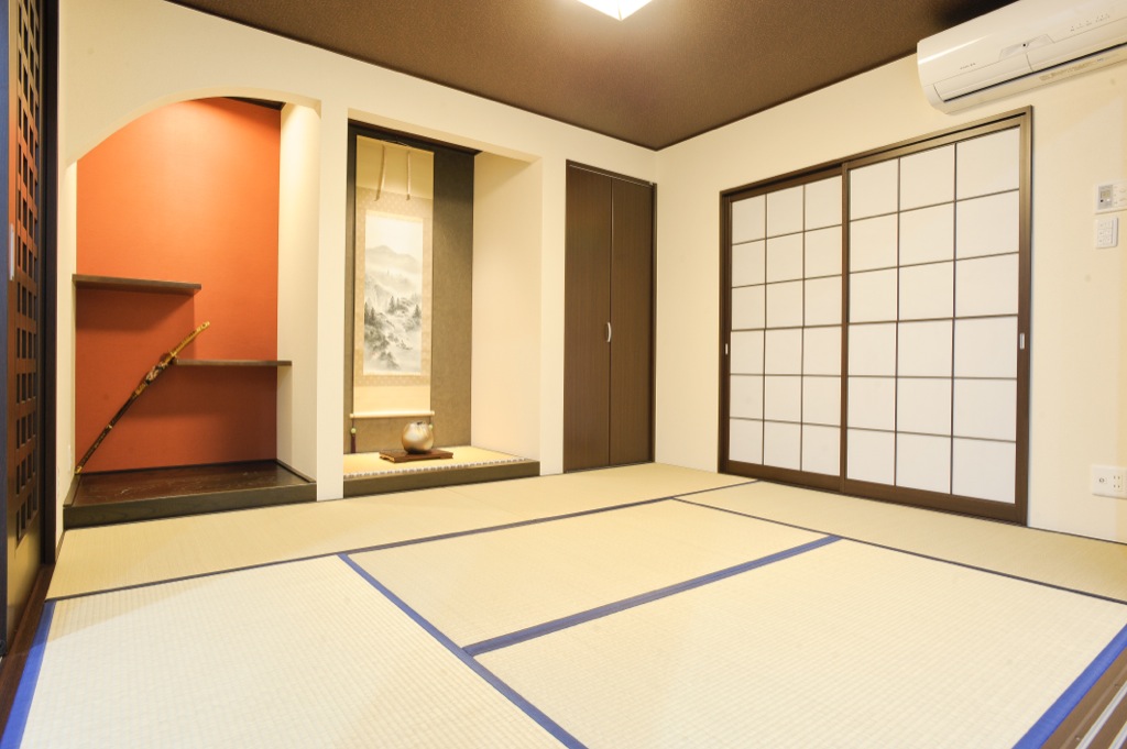 ゲストルームは落ち着ける和室に。宿泊も出来るように6帖の広さを設けています。布団をしまえる押入と、花や飾り物を置ける床の間も備えました。
