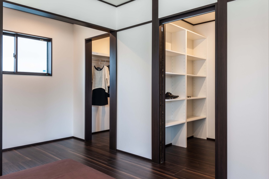 大容量のウォークインクローゼット(WIC)は、繋がりながらも分けているので夫婦平等に収納スペースを持てるのが特徴です。工夫次第で夏用・冬用のシーズンで使い分けることも。