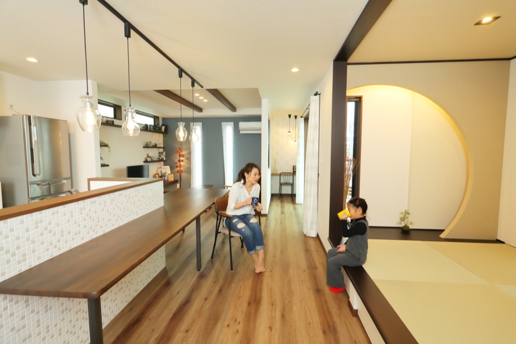 キッチンを囲むカウンターとダイニングテーブルで家族や友人とカフェ気分が楽しめます。キッチンからリビングを見渡せる動線も魅力です。カウンターでは食事以外にお子様の宿題スペースやお絵かきコーナー、PCコーナーとしても使えます。