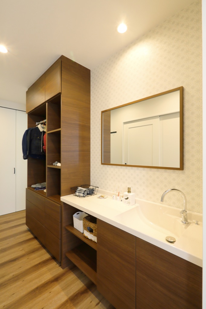 ウォークスルークローゼットには、よく着用するアウターや仕事着・カバン、子どものランドセルなど家族みんなのお出掛けのものや洗面脱衣室で使用するものなども収納できます。エアコンの効いたLDKと隣接しているので着替えもラクに。