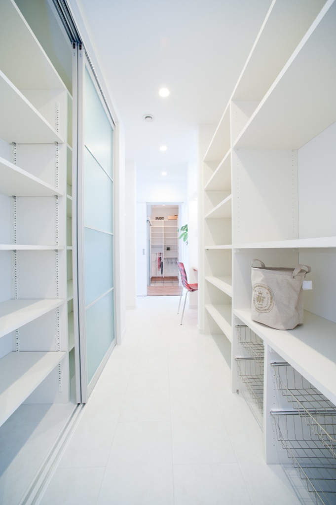 ウォークスルークローゼットには、頻繁に着用するアウターや仕事着、カバン、子どものランドセルなど、家族みんなのお出掛け用の物を収納できます。エアコンが効くスペースなので、帰宅後に着る部屋着もここに収納しておけば楽に着替えを行う事ができます。