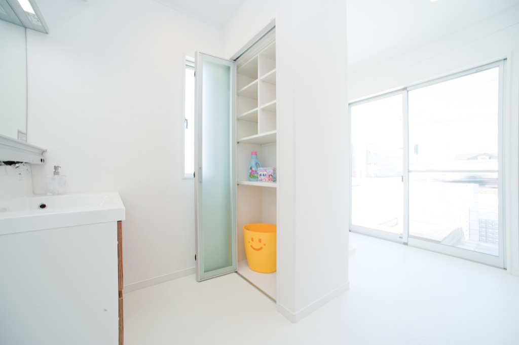 日当たりの良い南面に洗濯物を干せる南面ランドリースペース。室内なので雨天も関係なく部屋干しできます。洗濯機のすぐそばで干せるので、重たくなった洗濯物を運ぶ手間もありません。リビングと隣接させることで、部屋の加湿をしながら、洗濯物もよく乾きます。