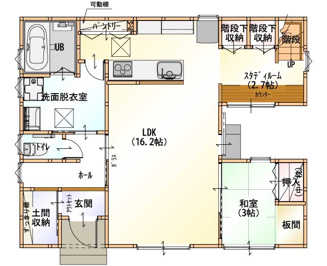 子どもたちがお絵かきや勉強する姿を見守りたい。自然とふれあいながら、感性が豊かになるお家で子育てをしたい。という要望を叶えたプランがこちら。庭の植物を眺めながら、絵を描いたり、勉強ができるスタディスペースをキッチン近くへ設けました。家事をしながら子どもの様子を見守る事が出来るので、近くで子どもも安心して過ごすことが出来ます。子どもの感性と成長を家と育む住まい感、いかがですか?