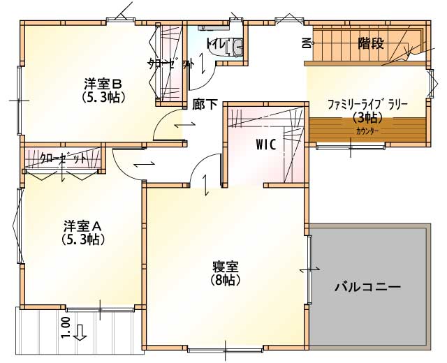リビング階段を採用する事で、家族とのコミュニケーションの場を作ります。2階に行くには絶対にLDKを通らないといけないので、帰ってきてもすぐに気づく事ができます。