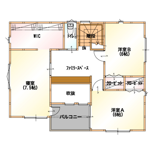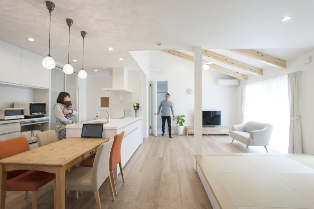 「自然に家族が集まるLDKを作りたい。」、「家事育児をしながらも、家族とのコミュニケーションを取れる間取りが良い!」といった要望を叶えたプランがこちら。家の中心にキッチンを設置する事で、ダイニング、和室までの距離感を近くし、“家事”をしながら“育児”出来る空間を作りました。2階のファミリースペースと繋がる吹抜けはキッチンの頭上にあり、開放感を感じながら家族の存在を感じられます。“LDK”が家族との繋がりを作る住まい感、いかがですか?