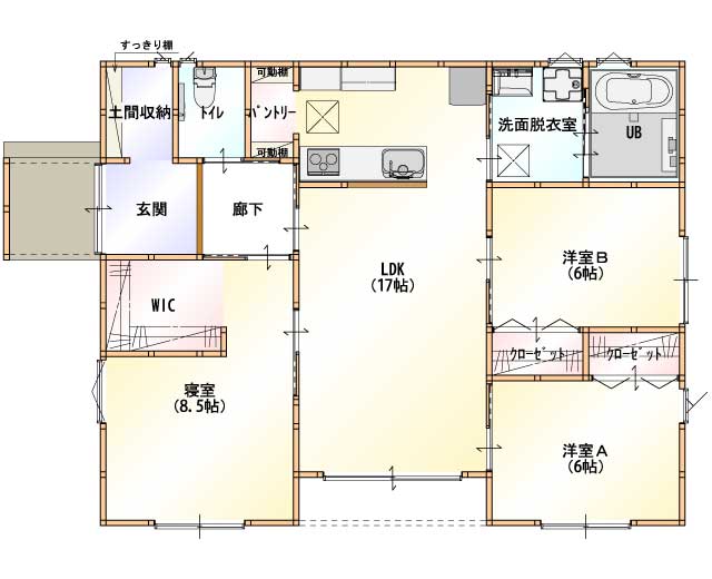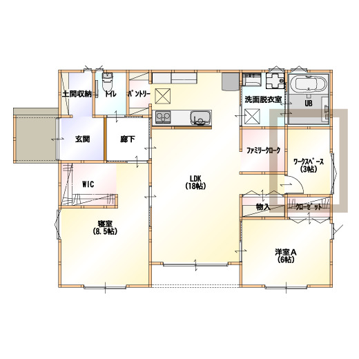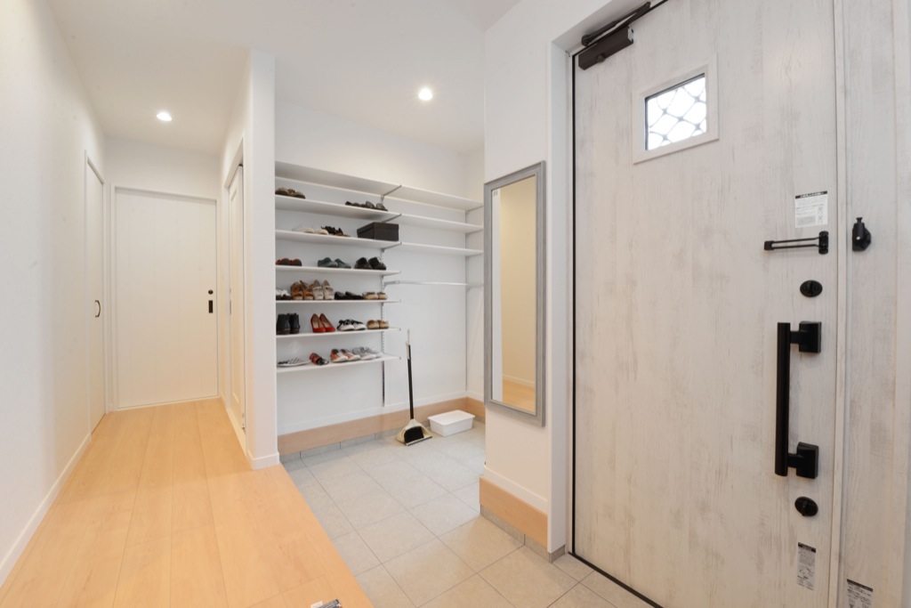 「これから永く住んでいくお家、将来どんなライフスタイルの変化にも応じれる様なお家を建てたい。」といった要望を叶えたプランがこちら。車椅子にも対応した空間作りを意識した間取りは、車椅子の旋回のしやすさや、建具を全て引き戸にするなど、細部まで“永く”安全に暮らせる家を実現しました。そこに、将来の老後まで階段を必要とせず、全ての部屋が苦にならずに使える“平屋”を採用。とことん“バリアフリー”に特化した住まい感、いかがですか?