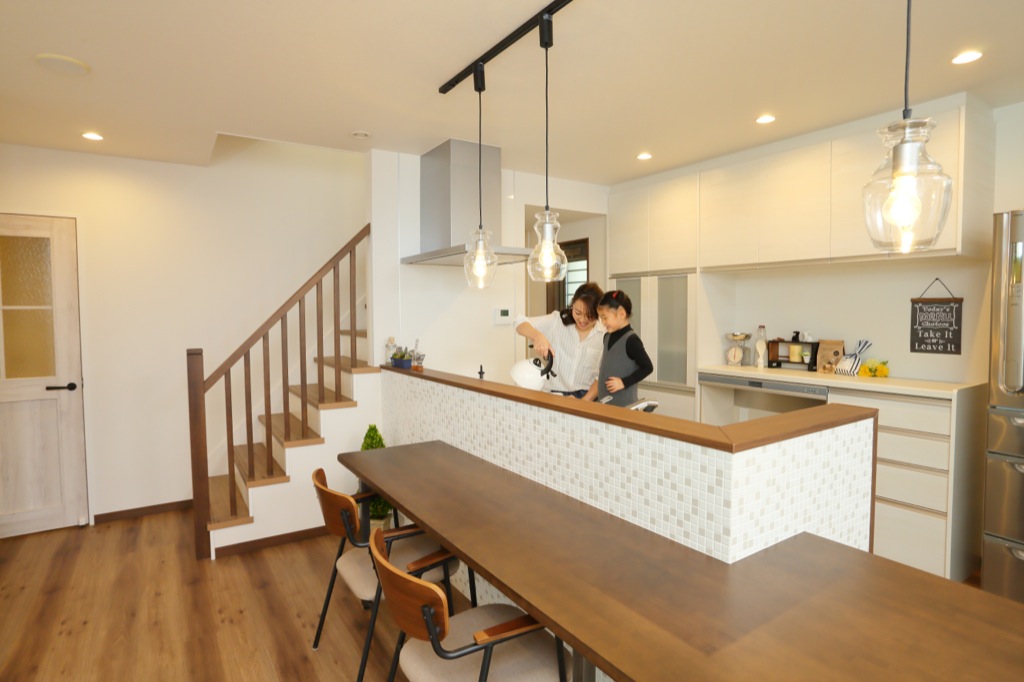 キッチンを囲むカウンターとダイニングテーブルで家族や友人とカフェ気分が楽しめます。キッチンからリビングを見渡せる動線も魅力です。カウンターでは食事以外にお子様の宿題スペースやお絵かきコーナー、PCコーナーとしても使えます。