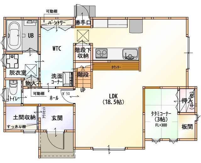 大好きなカフェ空間で料理を楽しみたい。お友だちとの集まりをカフェのような空間で楽しみたい。そんな要望を叶えたプランがこちら。キッチンを囲むカウンターとダイニングテーブルがまるでカフェのよう。ここで食事やお茶をするだけで、まるでカフェに居るかのような気分を楽しむ事が出来ます。大切なカフェの雰囲気を大切にするために収納も充実。生活感や余分な物を広いパントリーへまとめて収納できます。大好きなカフェ空間のある住まい感、いかがですか?