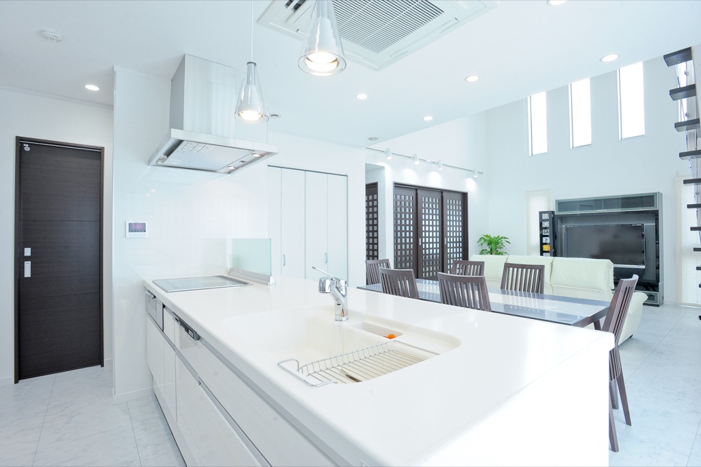 「自然に家族が集まるLDKを作りたい。」、「家事育児をしながらも、家族とのコミュニケーションを取れる間取りが良い!」といった要望を叶えたプランがこちら。家の中心にキッチンを設置する事で、ダイニング、和室までの距離感を近くし、“家事”をしながら“育児”出来る空間を作りました。2階のファミリースペースと繋がる吹抜けはキッチンの頭上にあり、開放感を感じながら家族の存在を感じられます。“LDK”が家族との繋がりを作る住まい感、いかがですか?