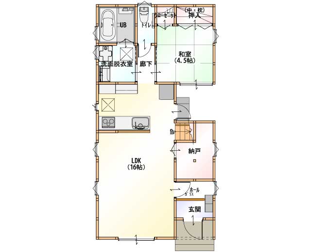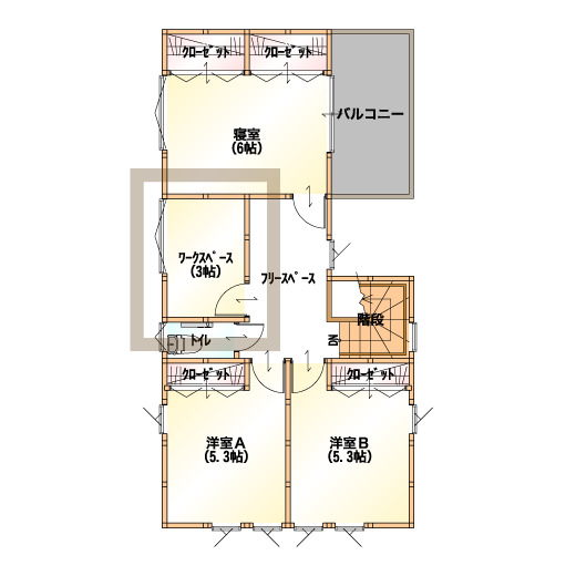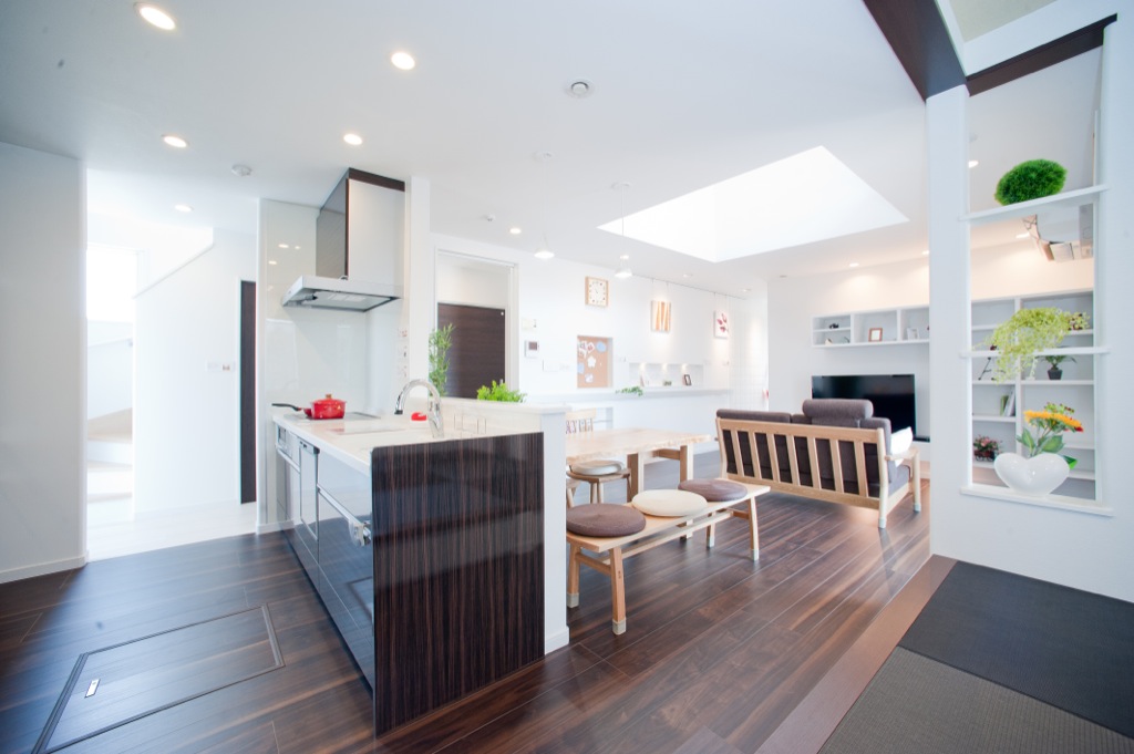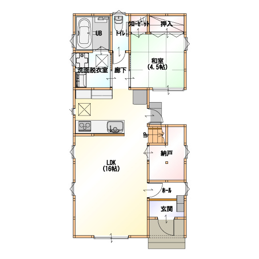 「出来るだけ間口を抑えたお家にしたい…」といった要望を叶えたプランがこちら。間口の狭い土地に対応した間取りとなっており、細長いゆえに取りづらい採光についても、坪庭を取り入れる事で補っています。この坪庭は各部屋から眺められるので、“癒し空間”として家族のみならず、来られたお客様も室内から楽しむ事が出来ます。細長いながらもゆとりの空間がある“縦長の家”という住まい感、いかがですか?