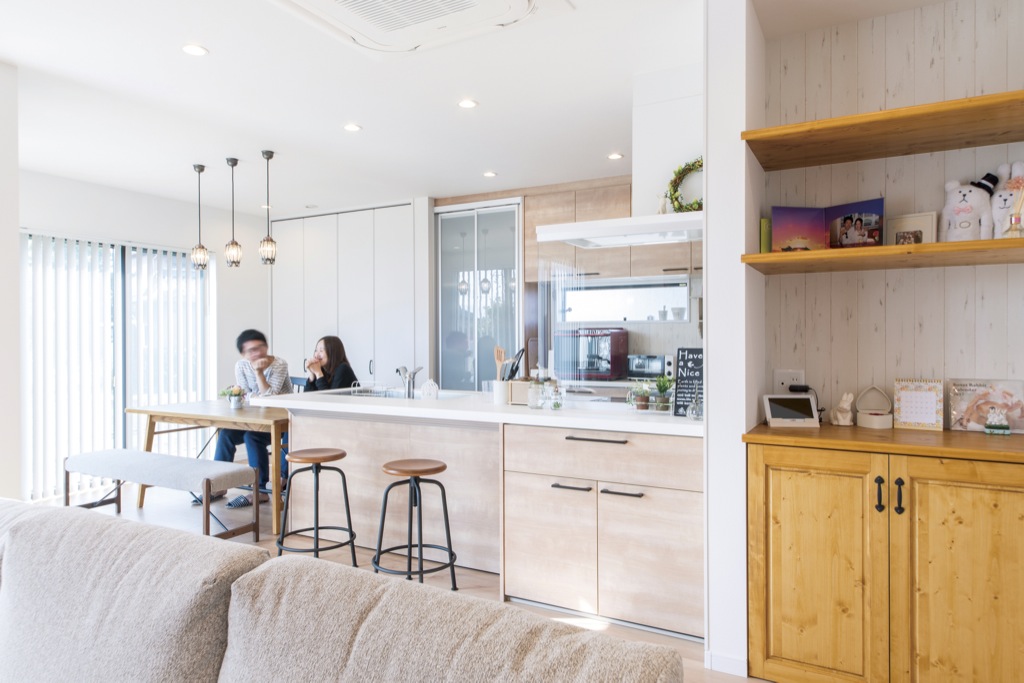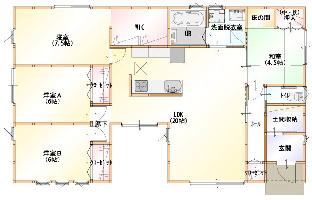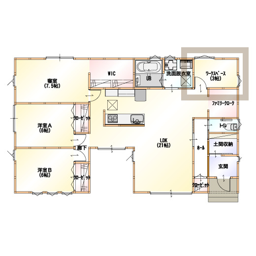 「将来ずっと住み続けられる平屋のおうちが良い。」、「自然を間取りに取り入れたい!」といった要望を叶えたプランがこちら。LDK、中庭を中心に置き、LDKから中庭のウッドデッキにそのまま出られる間取りとなっています。ウッドデッキでは、家族と一緒にガーデニングをしたり、子どもが小さい内はビニールプールをしたりと…使い方様々。家族の誕生から老後まで、長く、苦にならずに住める“平屋”という住まい感、いかがですか?