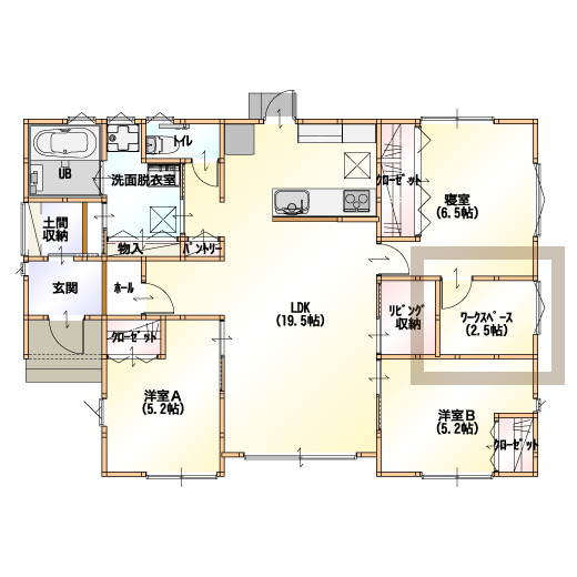 「焦らず子育てができる快適なお家にしたい。」、「家族とのコミュニケーションがたくさん取れる間取りにしたい!」といった要望を叶えたプランがこちら。LDKを中心とした間取りとなっているので、全部屋へのアクセスが可能となり、子育て中のご家族でも家事育児の負担が軽くなります。全ての部屋に繋がるリビングが、常に家族の憩いの場となる“家族の絆を育むリビング”がある住まい感、いかがですか?